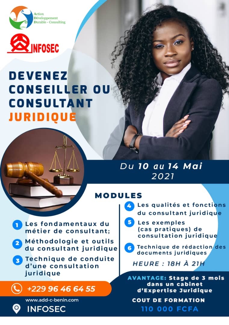 Toute entreprise quelque soit son domaine d’activité a besoin d’un Conseiller juridique en son sein. Le rôle du professionnel du droit a bien évolué ; il n’est plus seulement consulté lorsque le problème a surgi, mais conseille maintenant à titre préventif et est associé aux décisions stratégiques ; Pour mettre à disposition, des professionnels compétents les outils et méthodologies de conduite des affaires juridiques, le cabinet ADD Consulting en partenariat avec l'Infosec organise le présent séminaire de formation en vue de renforcer les capacités des praticiens du droit. Ce séminaire de formation est basée sur les fondamentaux du métier de consultant juridique avec présentation de la règlementation, des éléments et outils méthodologiques et retours d’expériences sur des cas.