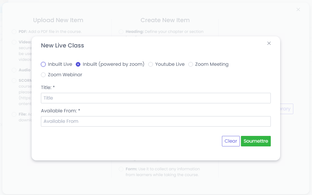 Sélectionnez "Inbuilt (poweredby zoom)" pour venir en direct depuis votre plateforme de cours uniquement.