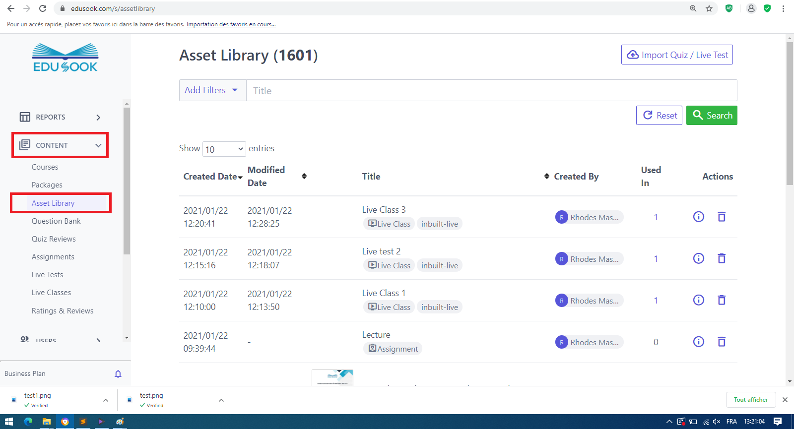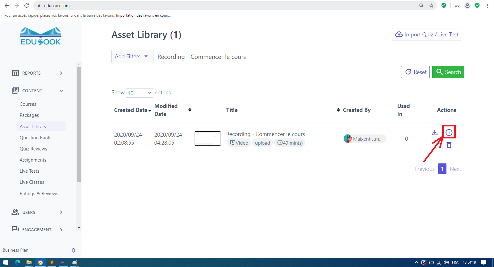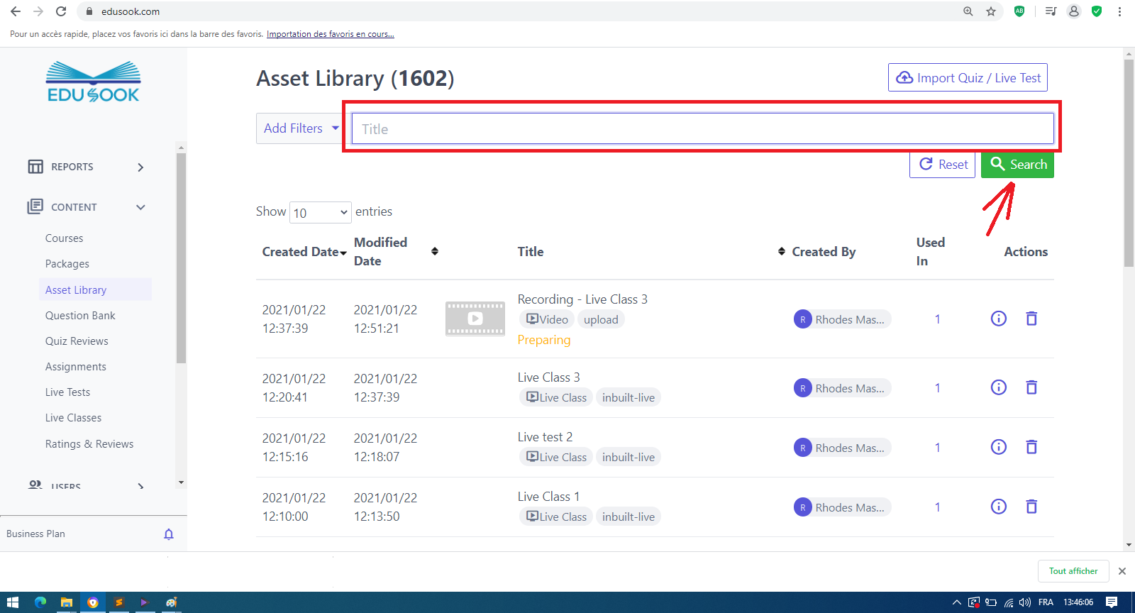 Pour voir tous vos enregistrements de cours en direct, allez dans "Ajouter des filtres" et sélectionnez "Type d'actif". Maintenant, choisissez "Enregistrement de classe en direct". Tous vos enregistrements de cours en direct jusqu'à la date seraient filtrés.